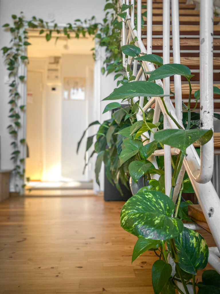 Kultaköynnös voi yhtä lailla reunustaa ovea. Tulee olo kuin astuisi sisään viidakkoon. Tässä kuvassa kultaköynnös myös vaeltaa rappustemme kaiteessa.
