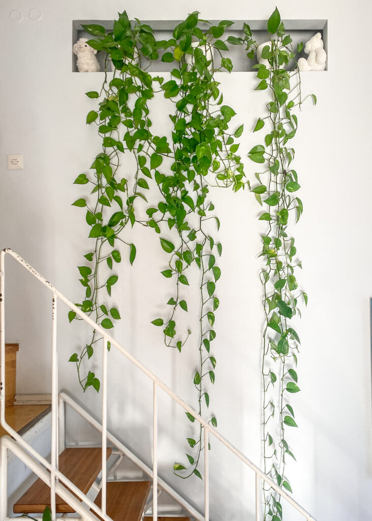 Rakastan köynnösten laskeutuvaa ja putoavaa linjaa. Sen katsominen rauhoittaa ja rentouttaa. Useampi kasvi vierekkäin luo vaikutelman viherseinästä.